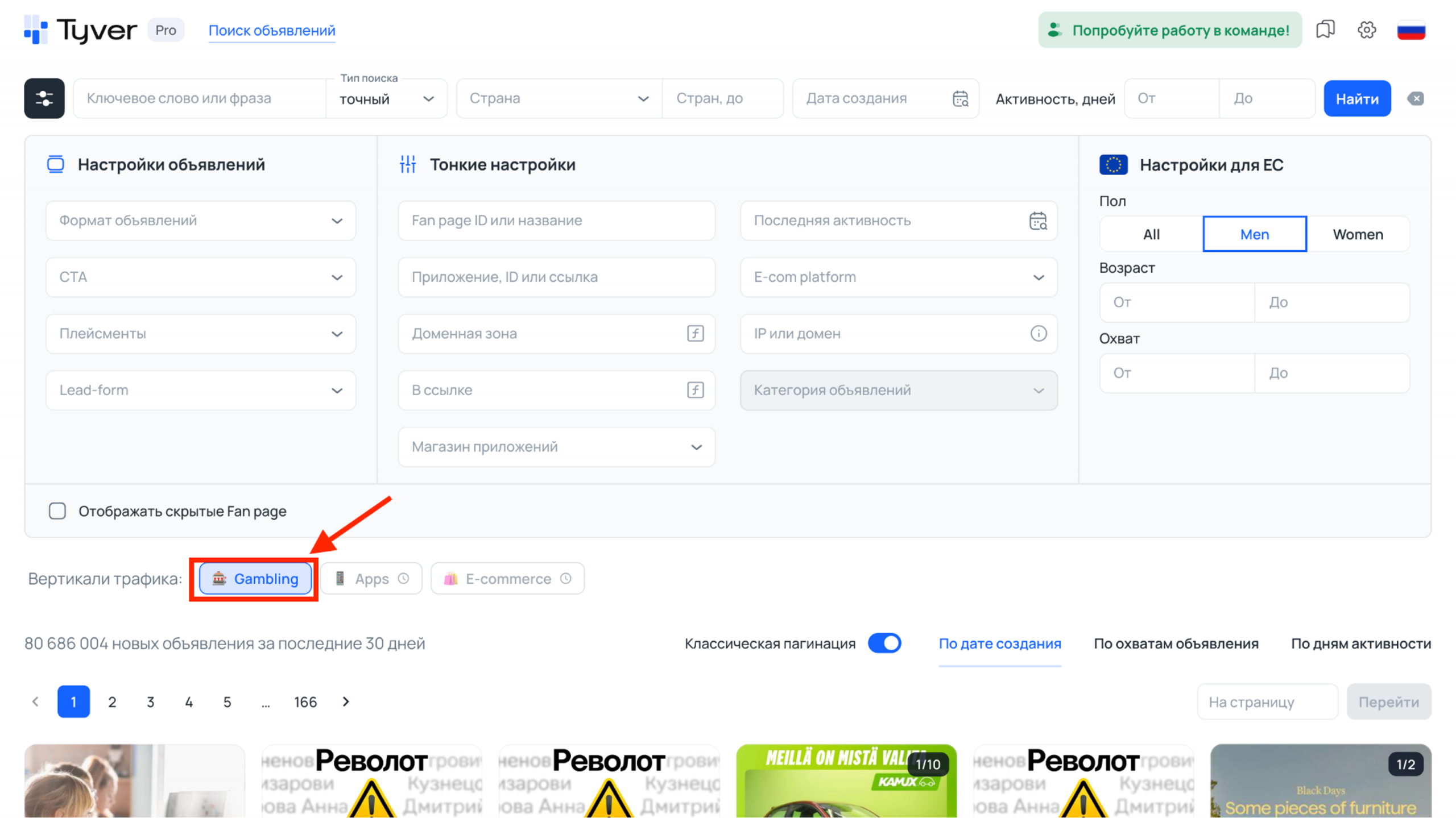 Также для того, чтобы упростить жизнь вебмастерам, спай-сервисы внедряют функционал, который позволяет буквально в один клик находить конвертящие креативы по конкретным вертикалям. Эта опция, например, уже реализована в Tyver, хотя пока это доступно только для ниши Гемблинг.