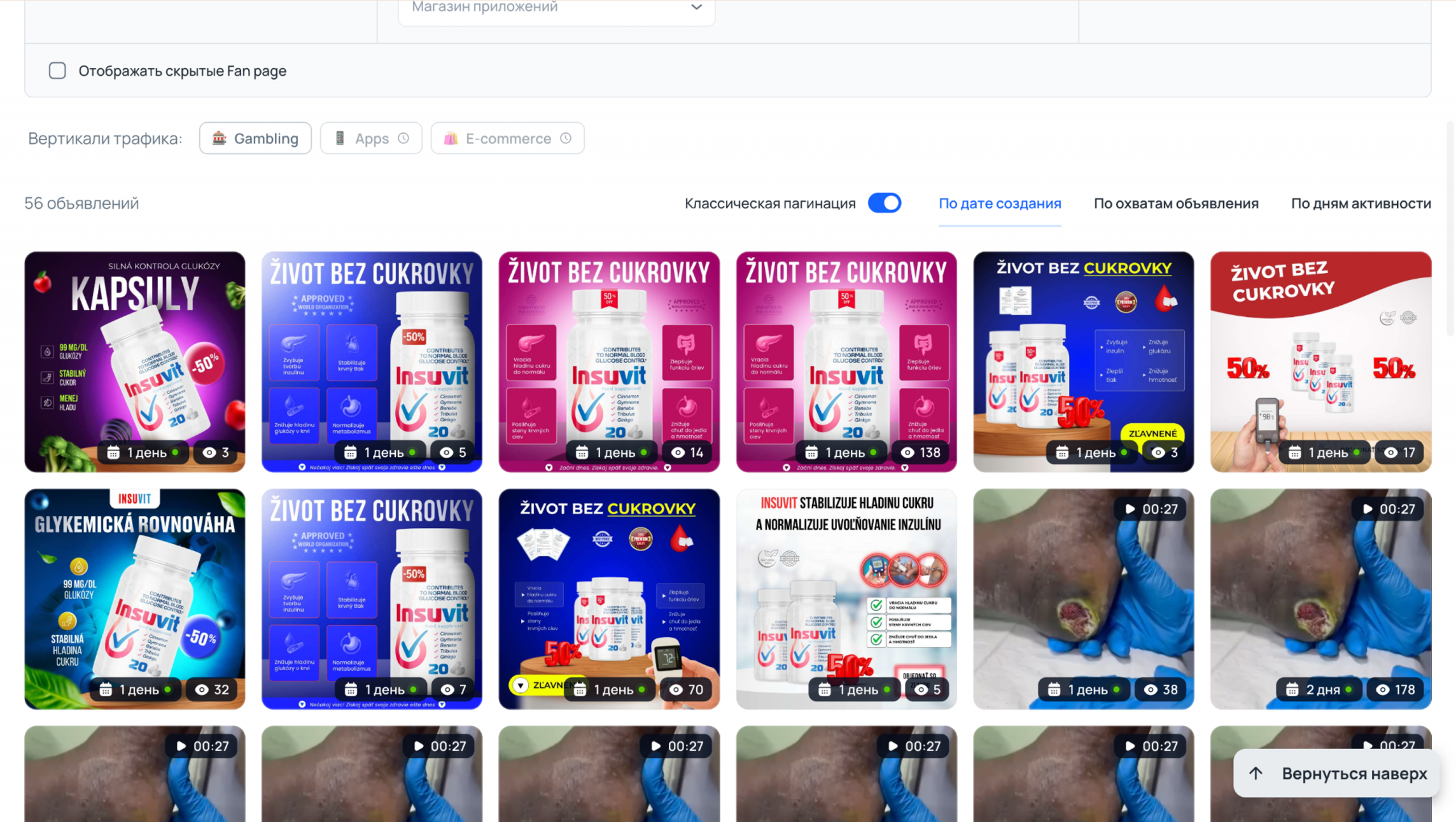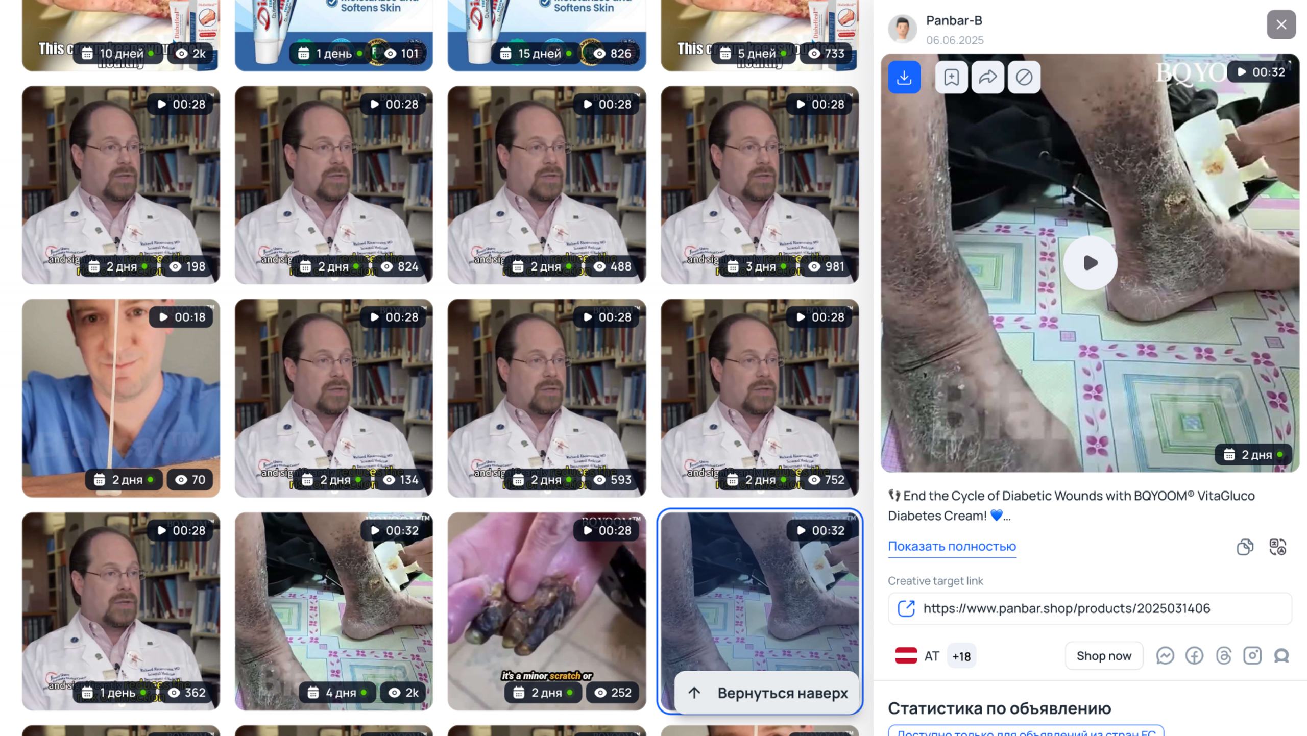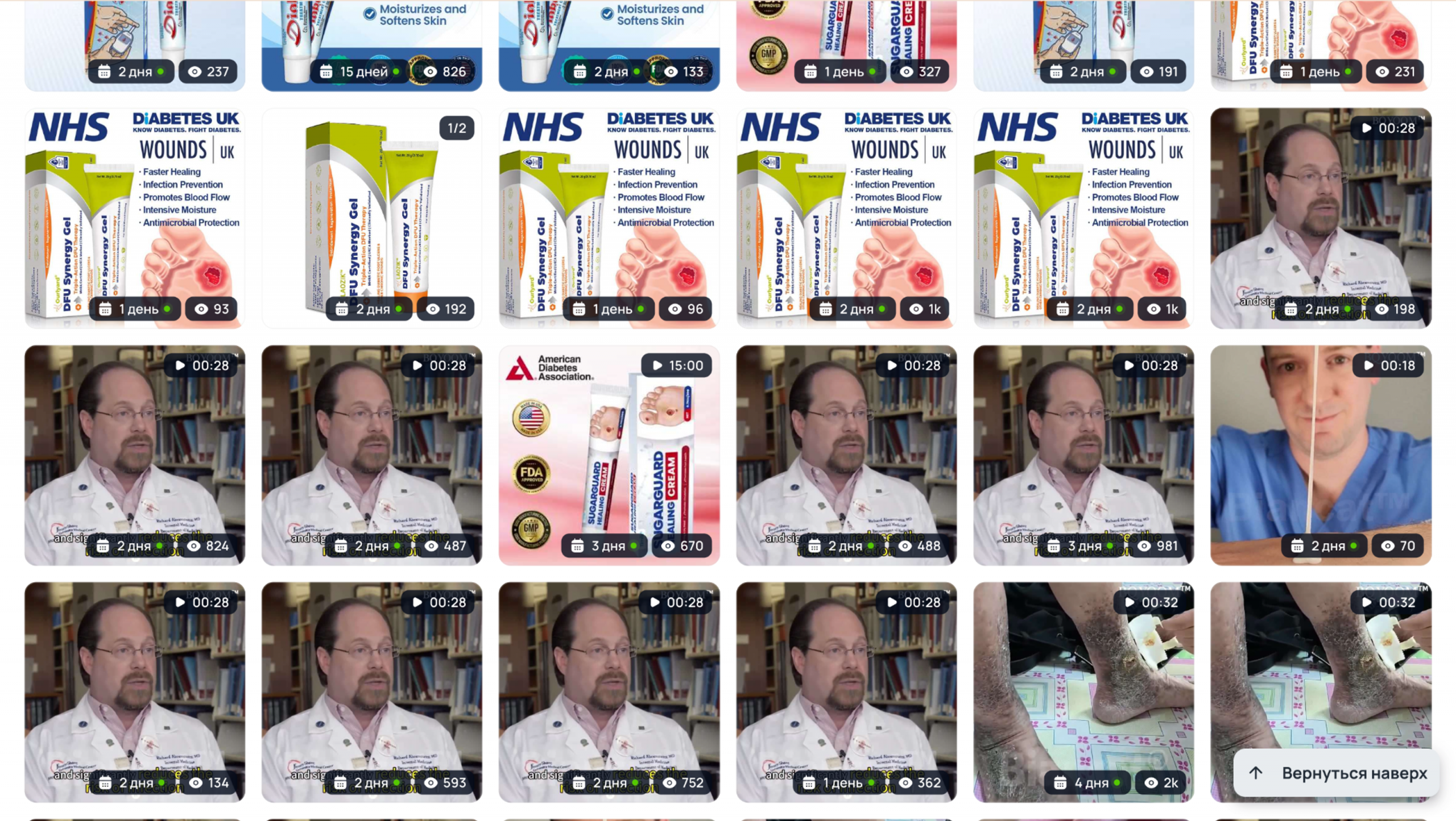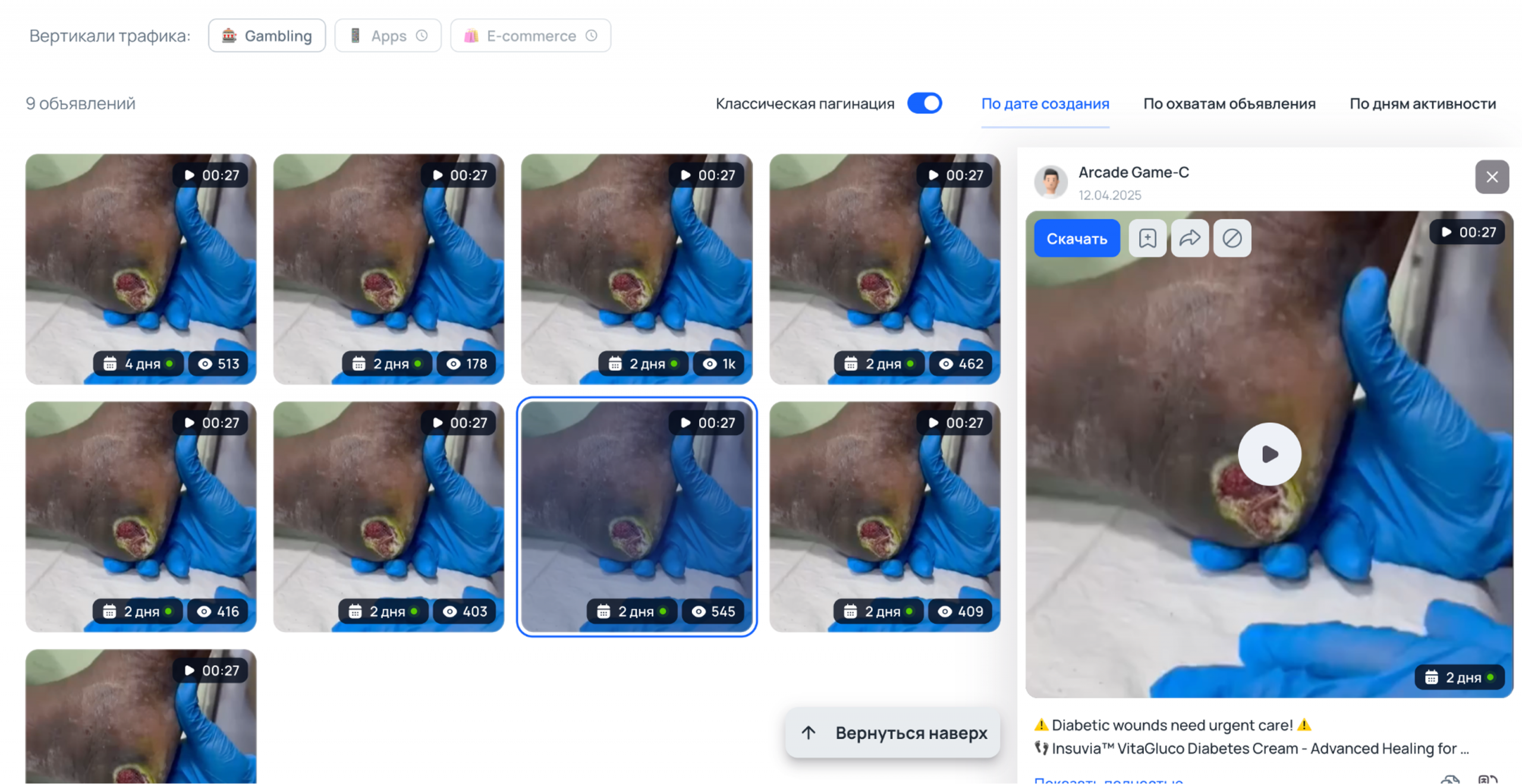 Теперь попробуем найти объявления не по названию оффера, а по широким ключам, вбив в поиск фразу «diabetic wounds». Tyver показал почти сотню креативов, и большую часть из них крутят именно арбитражники.