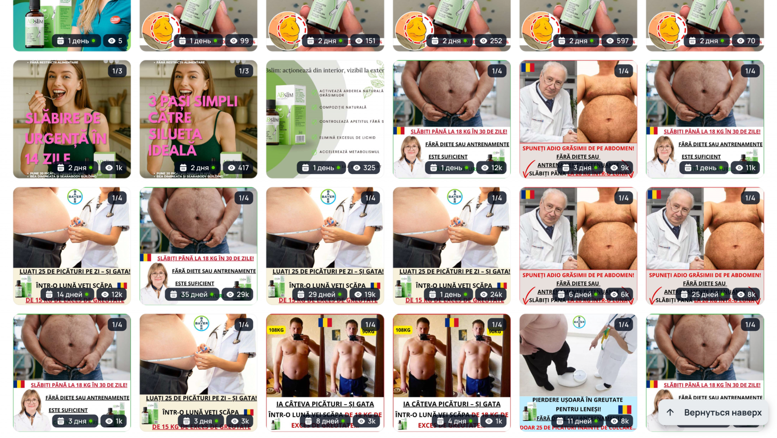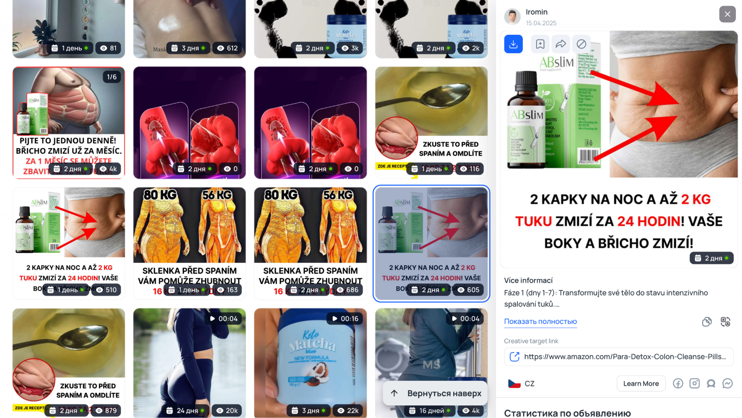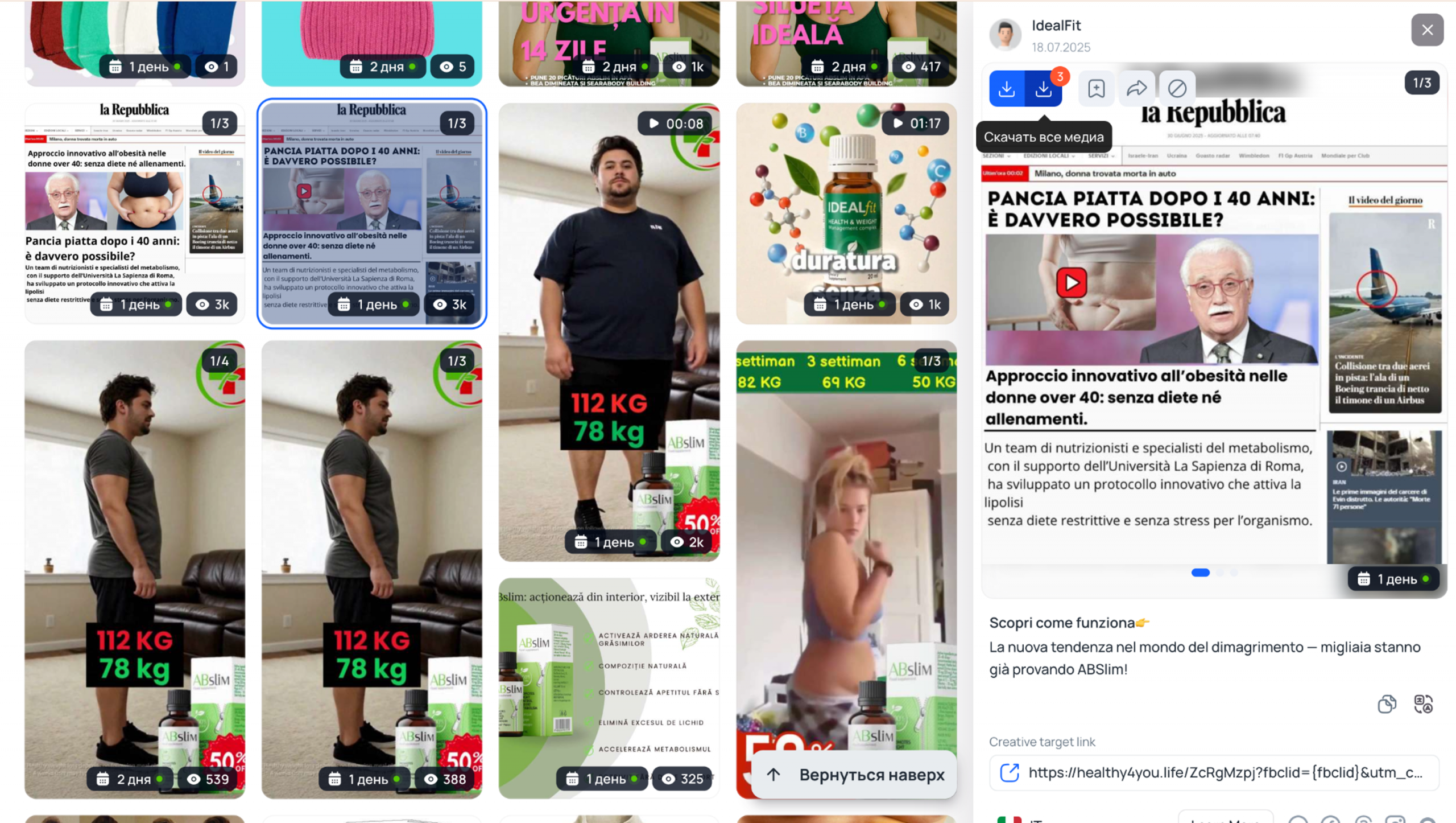 Теперь попробуем найти креативы по названию оффера ABSlim на Румынию. Как мы можем видеть, подход в креативах отличается от того, что был на Чехии.