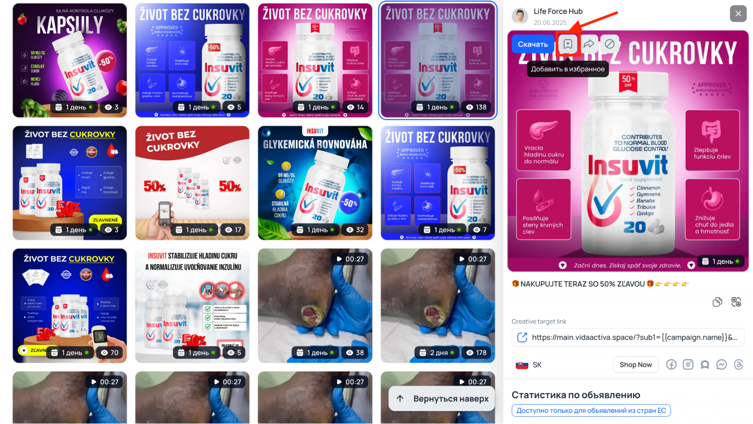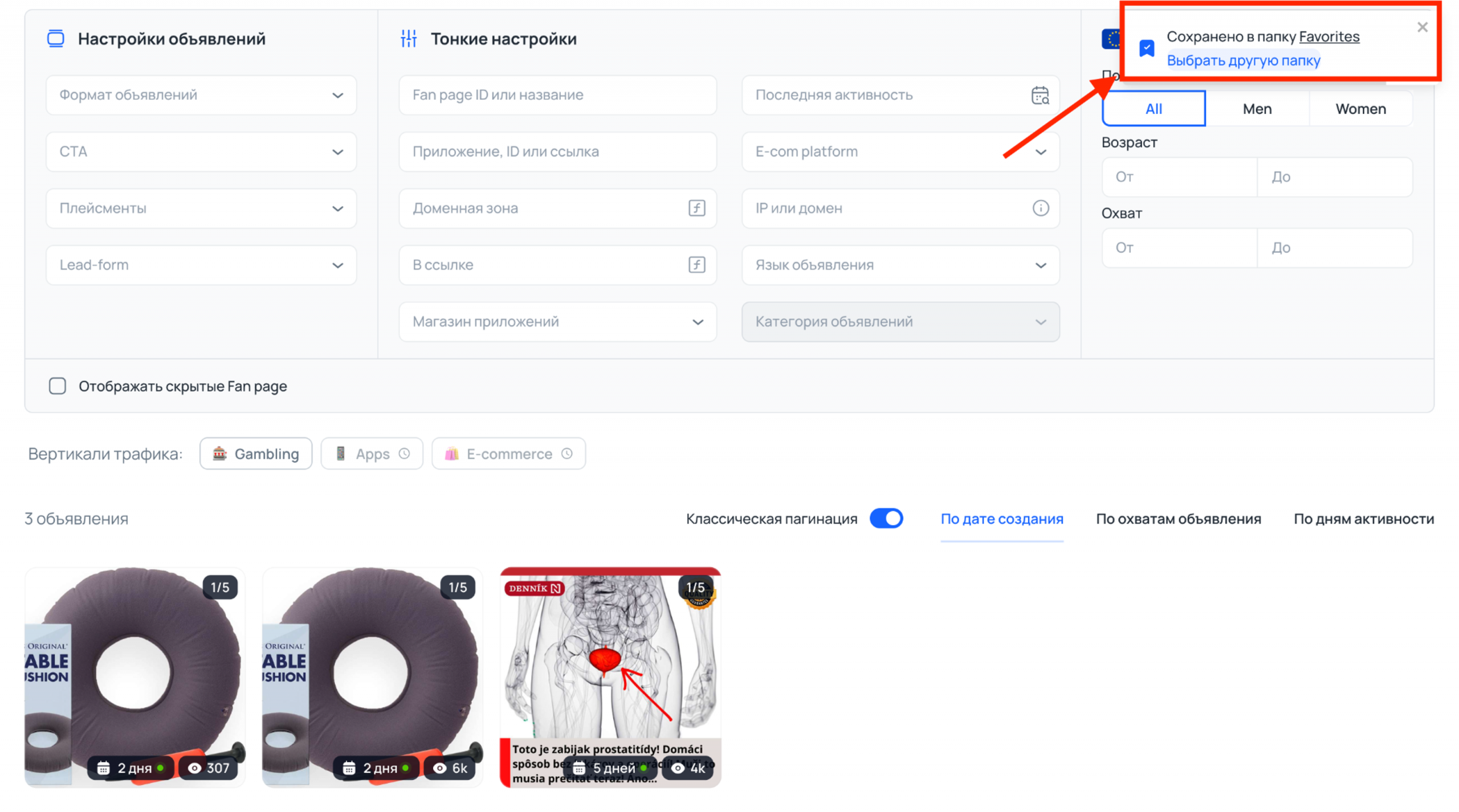 Разберем функцию сохранения и передачи креативов также на примере spy-сервиса Tyver. Когда вы нашли подходящее объявление, его можно в один клик добавить в список избранных.