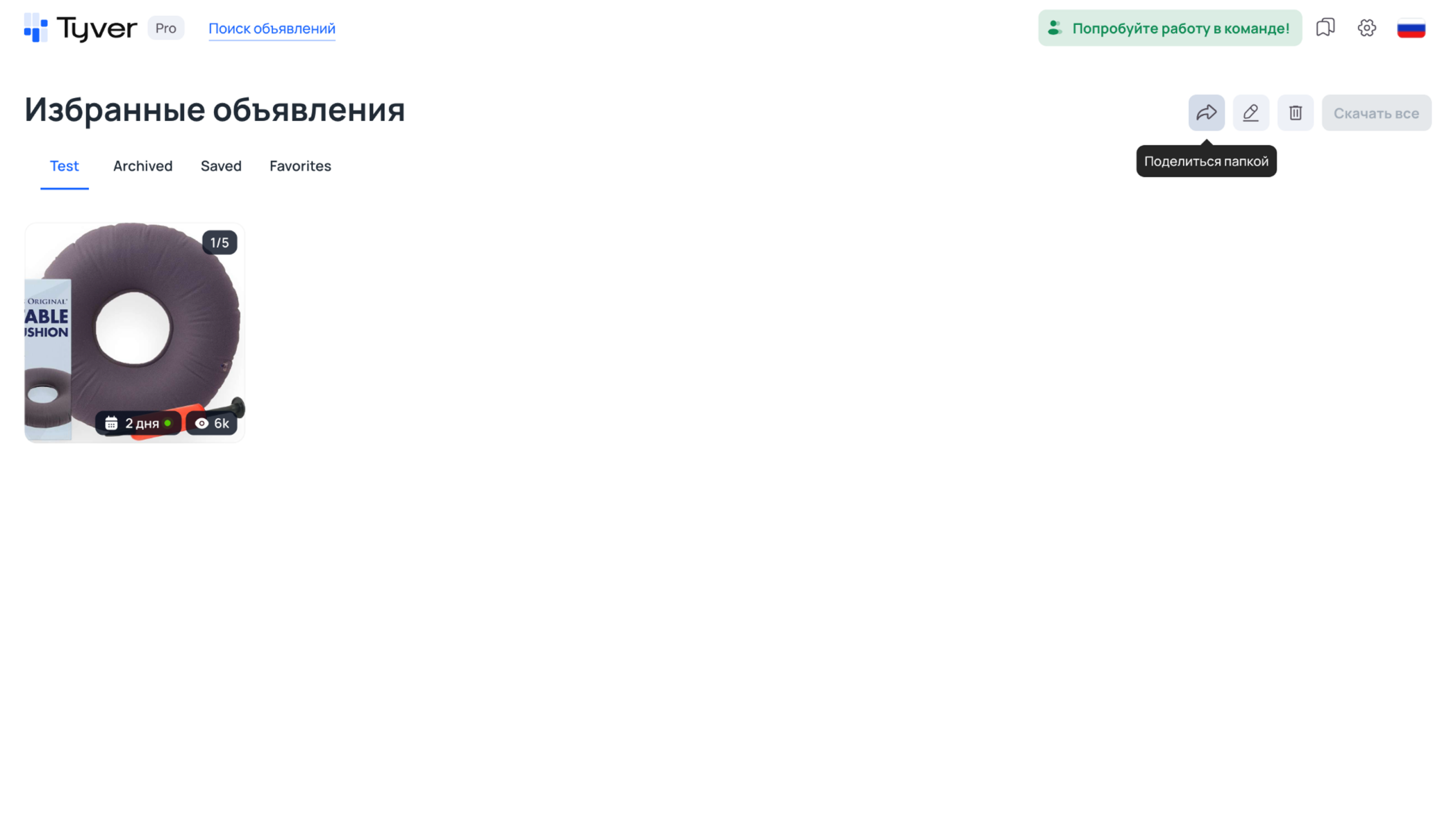 Откройте раздел «Избранные объявления», выберите нужную папку и нажмите «Поделиться». Ссылка автоматически скопируется в буфер обмена — ее можно отправить кому угодно, даже тем, у кого нет аккаунта в Tyver.