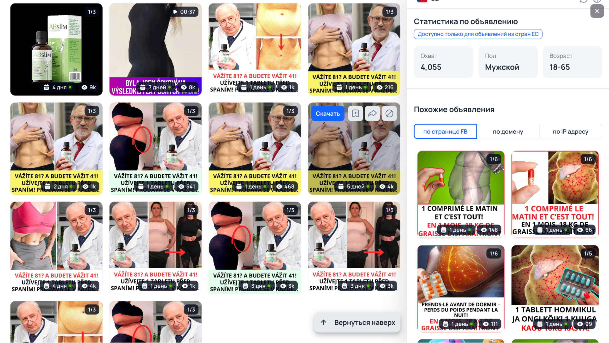 Чтобы найти больше креативов не под конкретный оффер, а в целом по теме похудения, можно открыть раздел «Похожие объявления» и посмотреть, что крутится с разных фанпейджей.