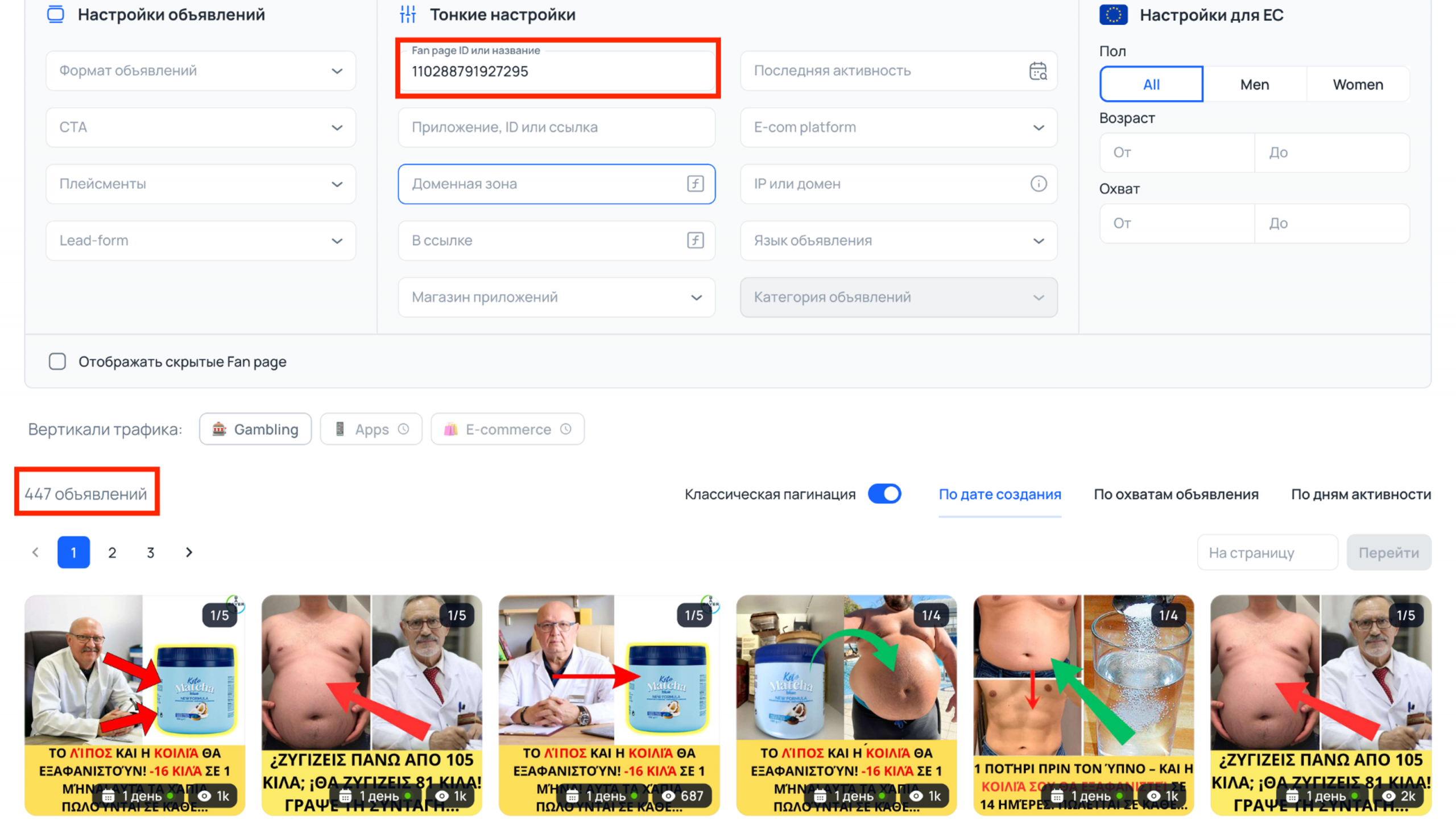 При открытии страницы Tyver сам подставит FanPage ID в фильтры и отобразит все объявления, которые крутились с этой ФП.