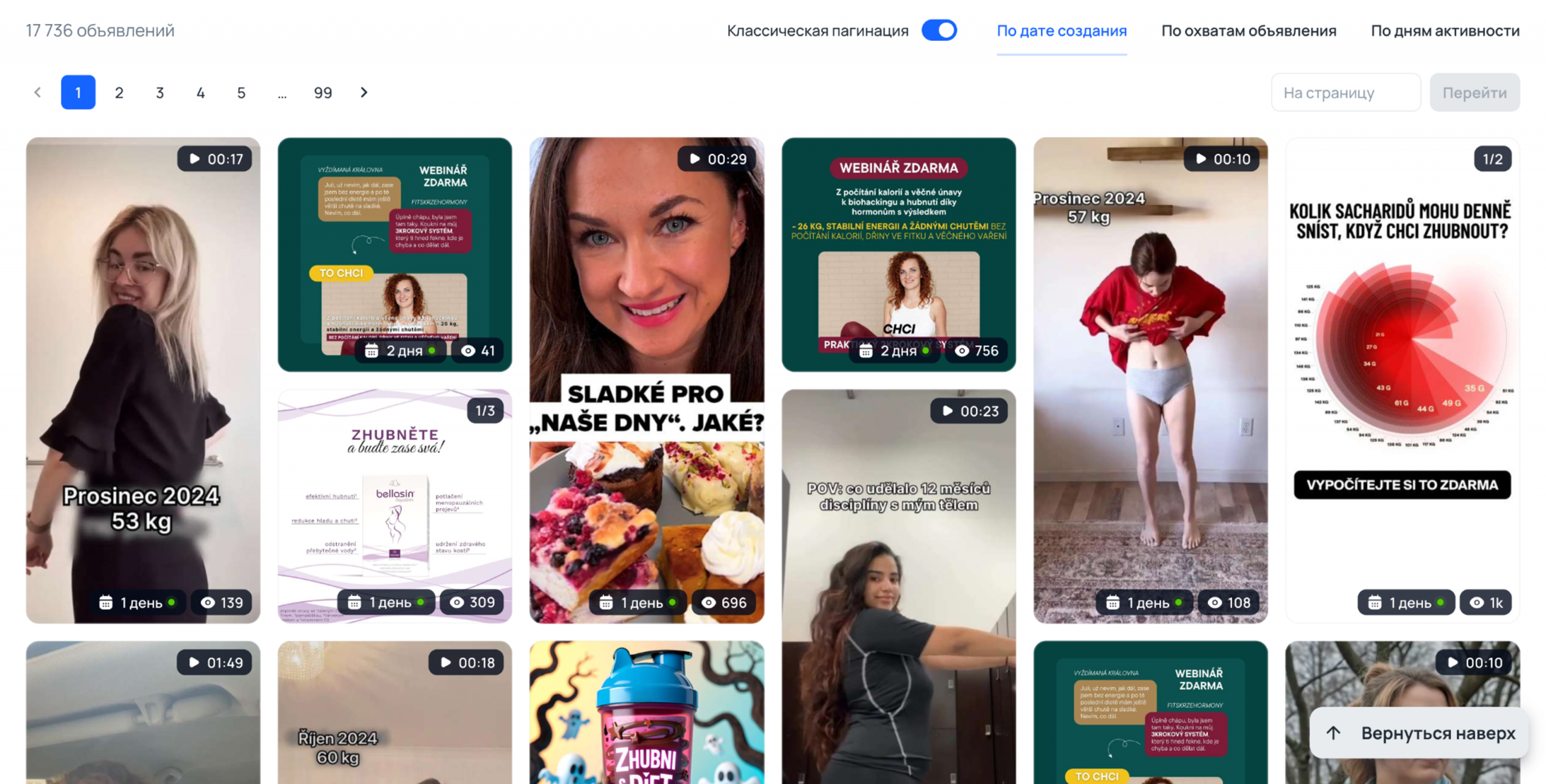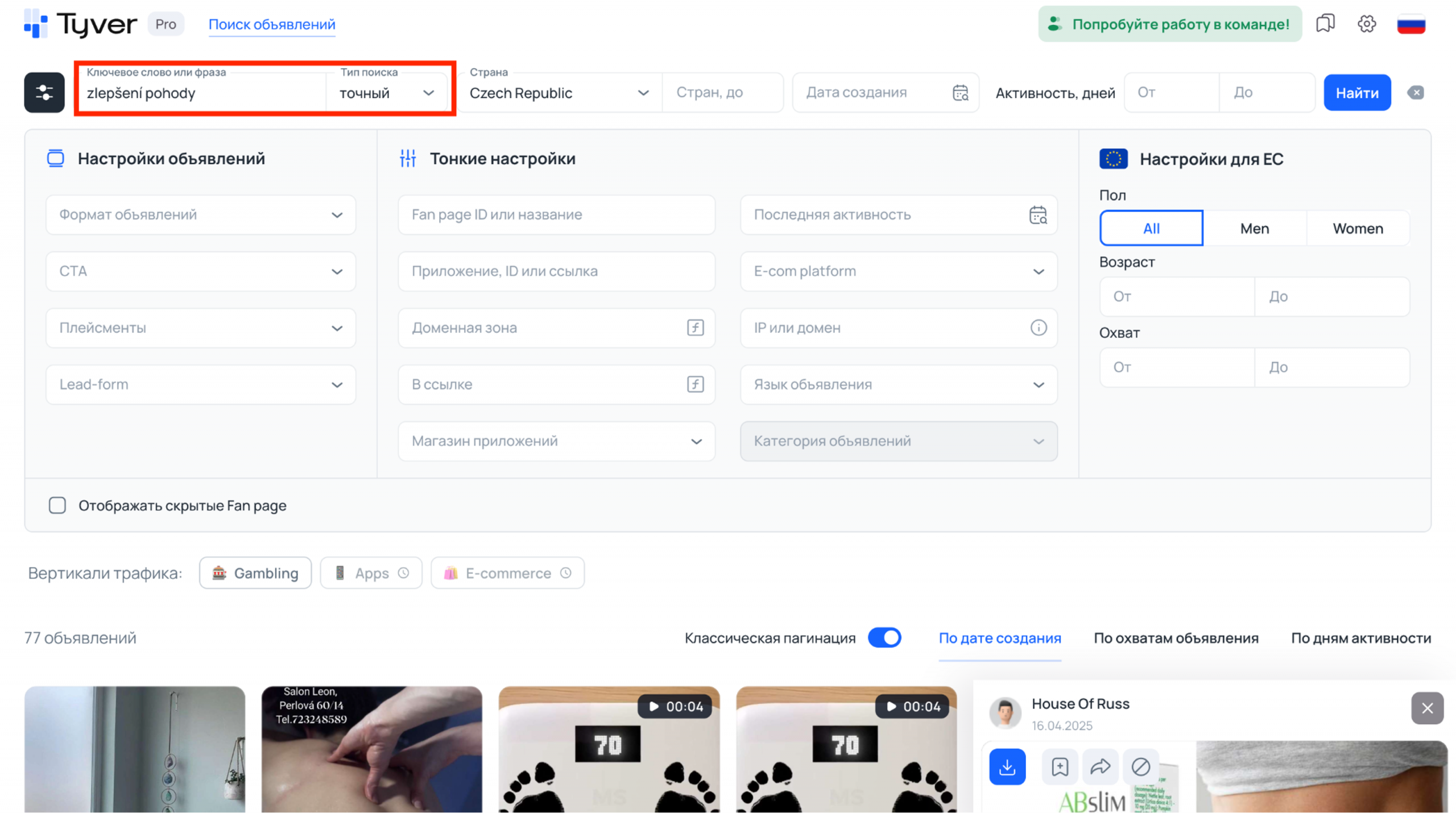 Теперь попробуем найти креативы на этот оффер по широким ключам. Если не знаете, как правильно подобрать слова для поиска, можно попросить ChatGPT. Достаточно скинуть ему название и описание продуктаНапример, по ключу «zlepšení pohody» Tyver выдал 77 объявлений.