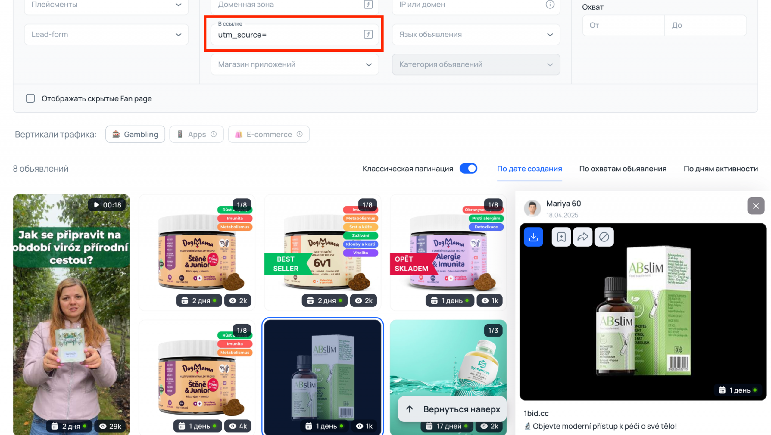 После применения параметра «utm_source=» выдача сузилась до 8 объявлений. Среди них также есть креатив на интересующий нас оффер.